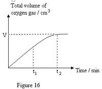31. Rajah 16 menunjukkan graf bagi jumlah isipadu gas oksigen yang terbebas melawan masa untuk penguraian hidrogen peroksida.